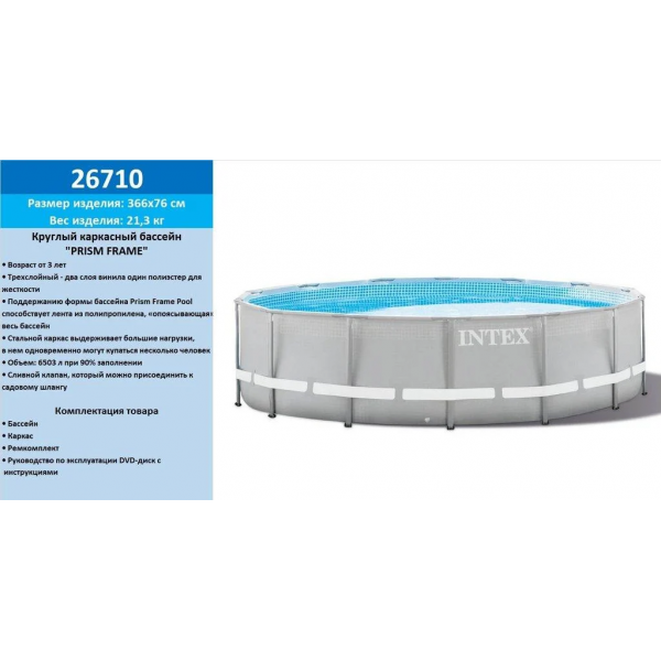 Набор!!! Каркасный бассейн Intex 366х76см, с тентом и альгитинн, арт. 26710 в наборе Характеристики: Размер: 366x76 см Глубина воды: 61 см Объем: 6503 литров (90% наполнения) Диаметр патрубков ..