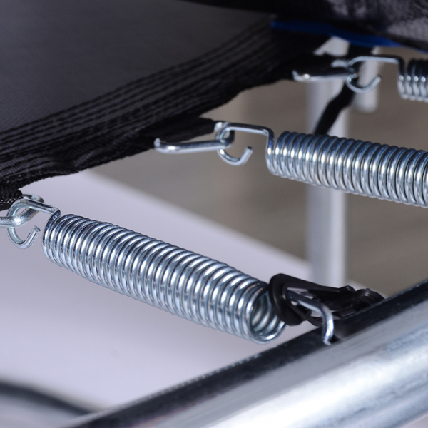 - Пружины батута Atlas Sport, которых в данной модификации – 72 штуки, имеют особую форму для правильного распределения нагрузки на металл при растяжении. Пружины присоединяются к полотну при помощи треугольных карабинов на петле, каждая из которых прострочена 8-ю плотными фабричными швами, что полностью защищает от разрывов в местах крепления пружин.