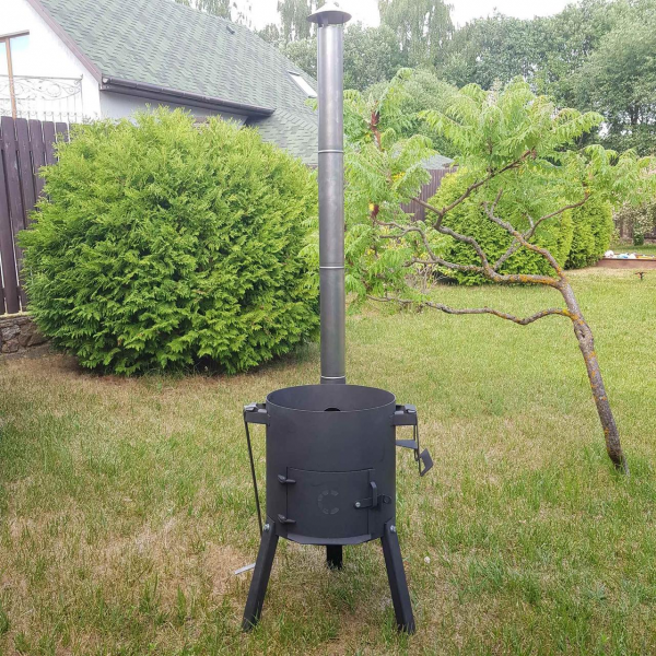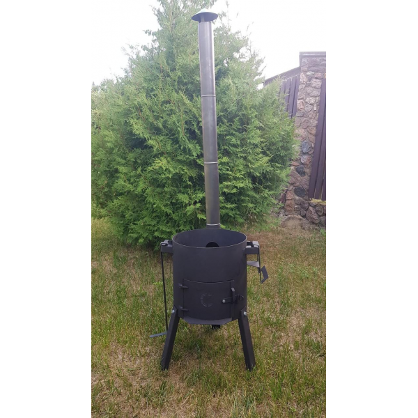 Комплектность: Корпус печи 1шт, Ножки 3шт, Кочерга-1шт, Ключ-1 шт, Держатель крышки казана-1шт, Труба дымохода-3шт, Колпак дымохода- 1шт, Болт-3шт,Шайба-3шт