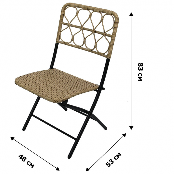 Габариты элементов (ШхГ/ДхВ) : 2 кресла:53х48х83 см, стол:60х60х72 см.