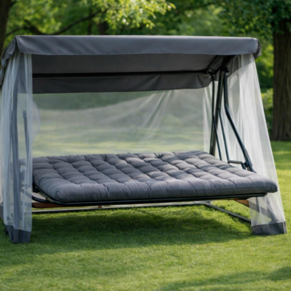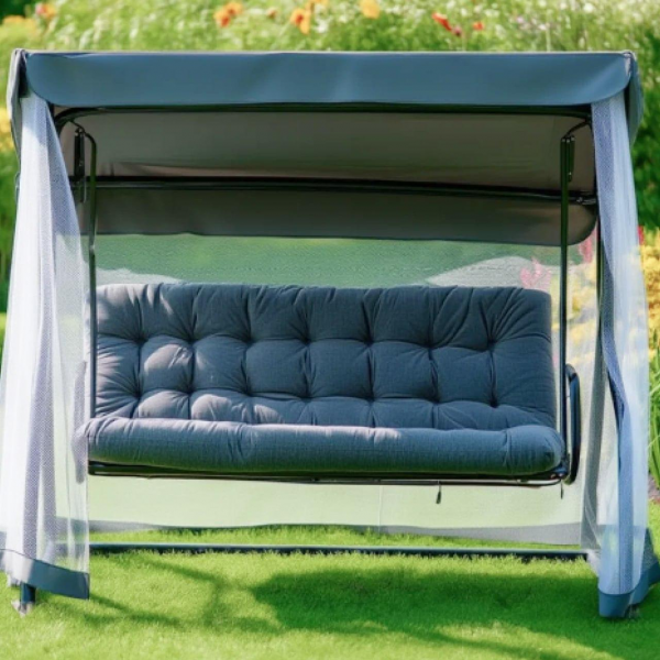 - Функциональность: спинка раскладывается и фиксируется в горизонтальном положении, трансформируя качели в удобное место для лежачего отдыха.