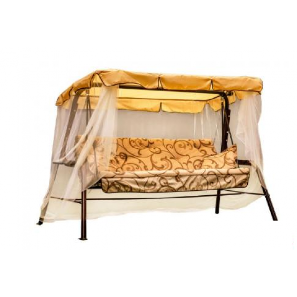 Размеры конструкции позволяют с комфортом разместиться втроем. Для защиты от палящего солнца предусмотрен тент.
