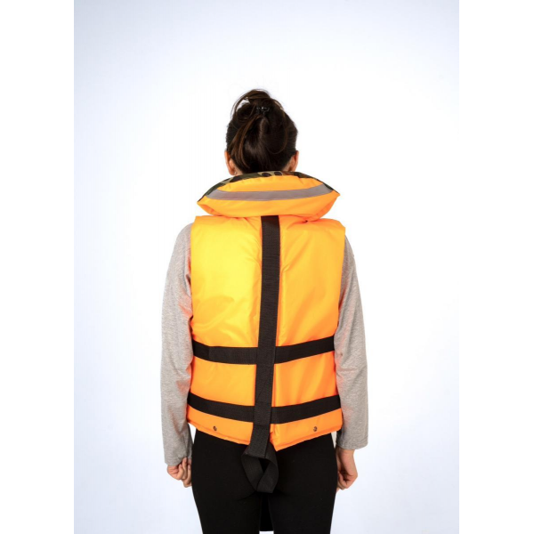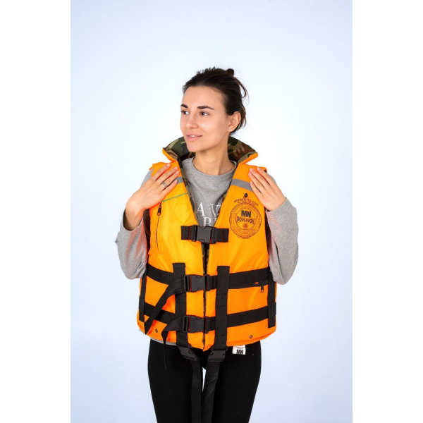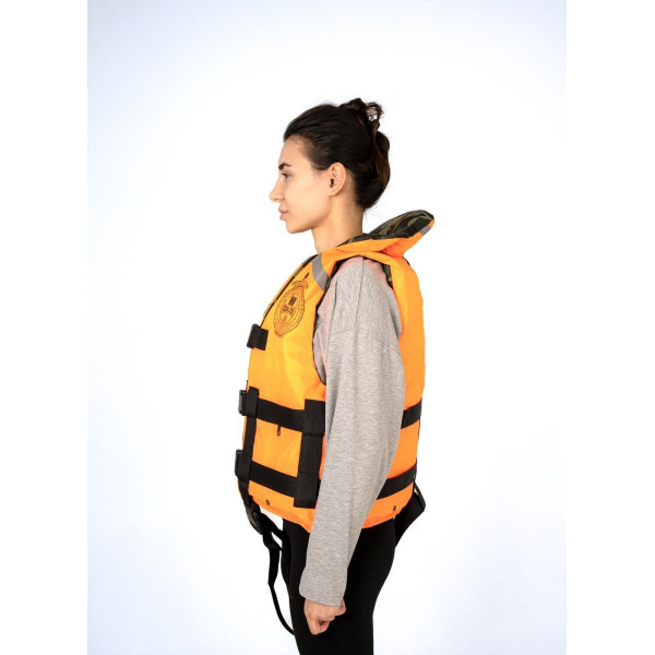 - Спасательный жилет для рыбалки сшит из влагонепроницаемой ткани "Оксфорд" сигнального ярко-оранжевого цвета.