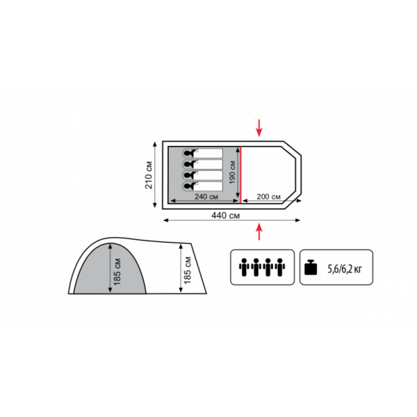Характеристики Тип палатки- Кемпинговая Форма палатки- Полусфера Вместимость, чел- 4 Длина, см- 440 Ширина, см- 210 Высота, см- 185 Вес, кг- 6.2 Влагостойкость, мм- 2000 Влагостойкость дна,..