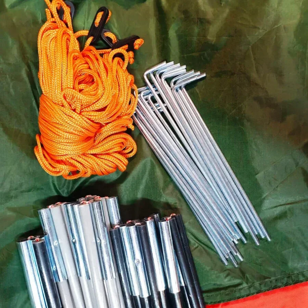 Комплектация: Тент палатки, внутренняя палатка, дуги, колышки, оттяжки, сумка чехол для хранения