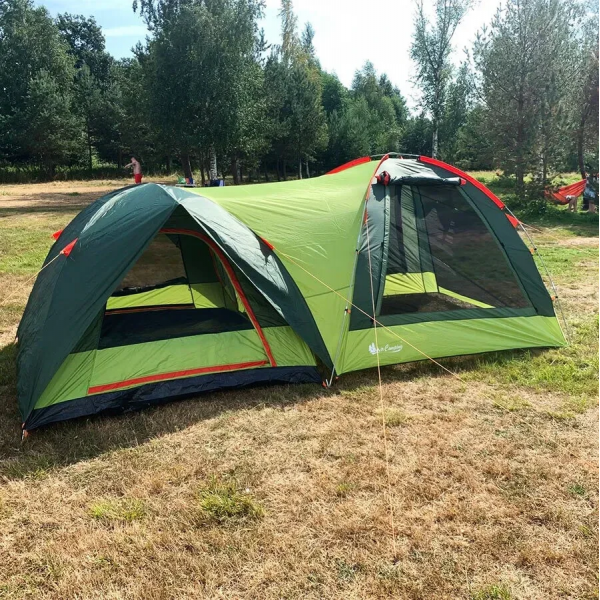 Высота тамбура - шатра 175 см, с двух сторон он имеет большие окна с москитными сетками для проветривания. Палатка имеет 3 входа: 2 в спальное отделение и 1 в тамбур (между тамбуром и спальной капсулой также есть проход).