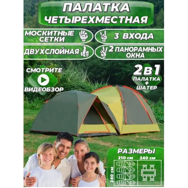 Палатка шатер 2 в 1 Mircamping 1005-4 четырехместная с тамбуром подойдет для семейного отдыха, туристического выезда на природу, установки в кемпинговом лагере. Палатка с тамбуром-шатром имеет простор..