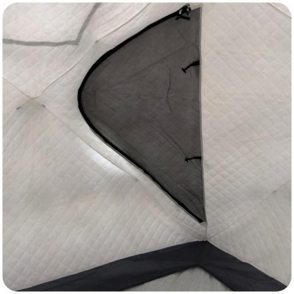 - Ткань палатки четырехслойная и утепленная. Внешний слой выполнен из ткани оксфорд, которая устойчива к износу и влаге. Внутренний слой из ткани оксфорд 210T PU с утеплителем сохраняет тепло и предотвращает конденсат. Утепленная часть при необходимости отстегивается, что делает палатку универсальной для разных сезонов.