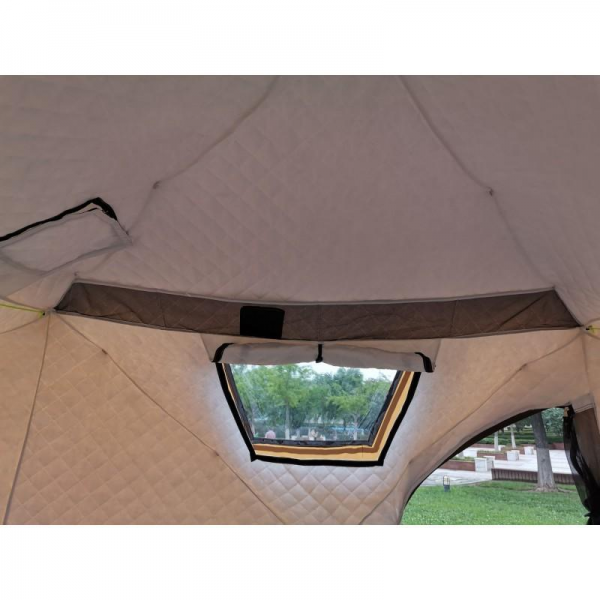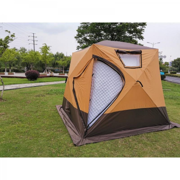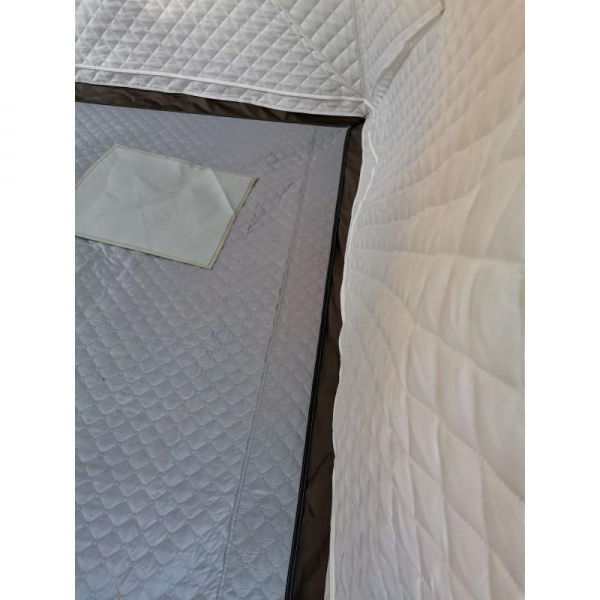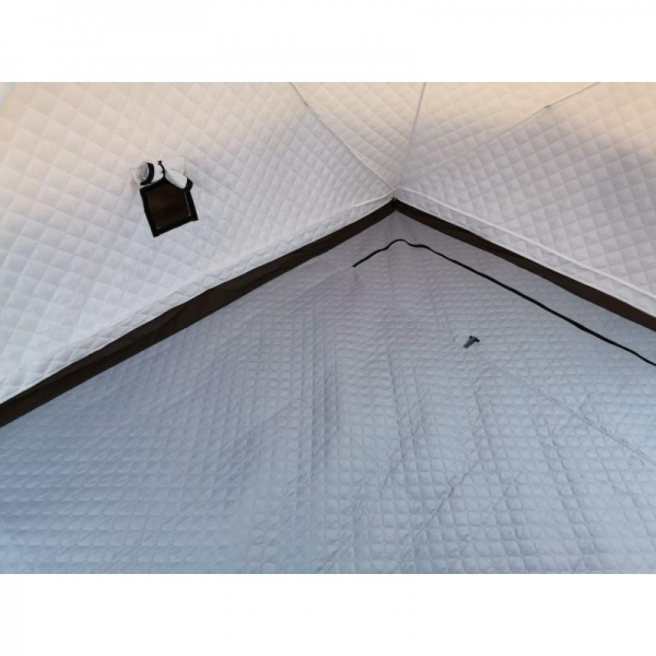 .Внешний слой выполнен из ткани оксфорд 420D PU для защиты от ветра и влаги, а внутренний выполнен из ткани оксфорд 210T PU + утеплитель: хлопок 110гр на кв/м W/R + 210T PU. Внутренняя утепленная часть при необходимости отстегивается, за счет этого палатку можно использовать круглый год.
