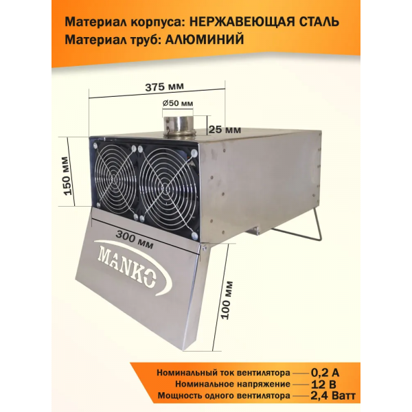 Теплообменник Манко с двумя кулерами предназначен для обогрева зимних рыболовных палаток, а также помещений, складов, гаражей без вреда для здоровья, за счёт выхода отработанных газов через герметичное соединение труб за пределы палатки.