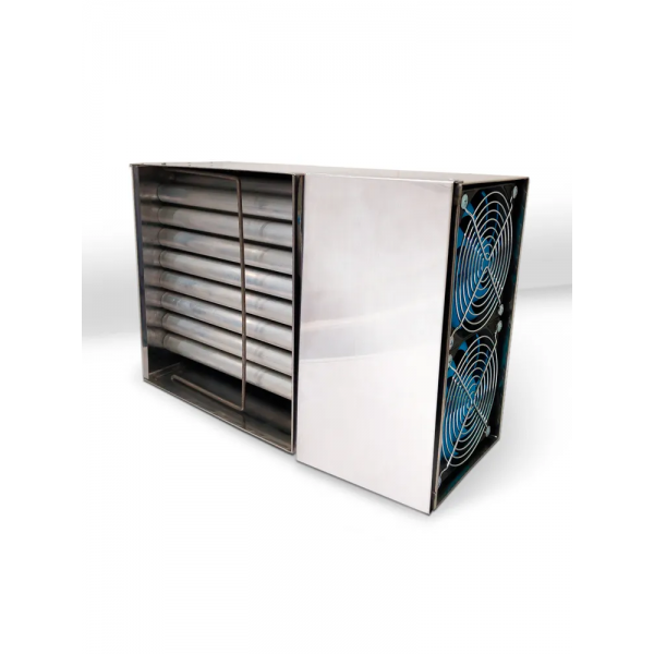 Между вентиляторами и трубками имеется небольшой зазор, который препятствует расплавлению вентилятора и способствует равномерному продуву трубок. Прямоугольная форма и конструкция теплообменника, позволяют получить увеличенную площадь теплообмена, что обеспечивает высокие показатели КПД, при небольших габаритных размерах.