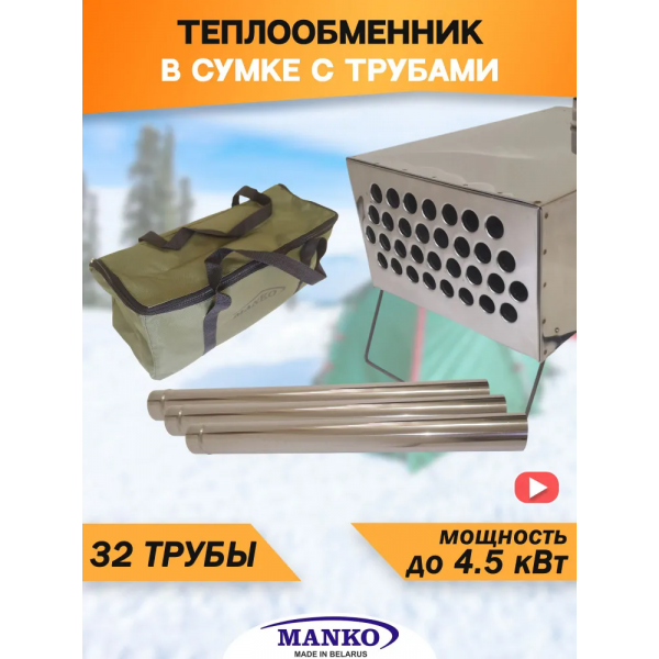Теплообменник MANKO на 32 трубы в сумке и трубами (3 шт.) Теплообменник Манко с двумя кулерами предназначен для обогрева зимних рыболовных палаток, а также помещений, складов, гаражей без вред..