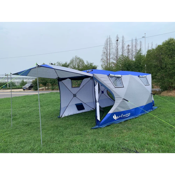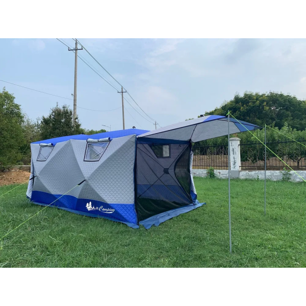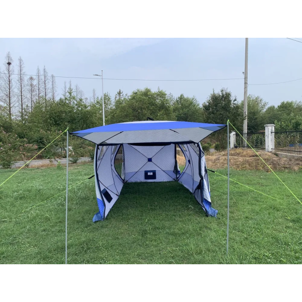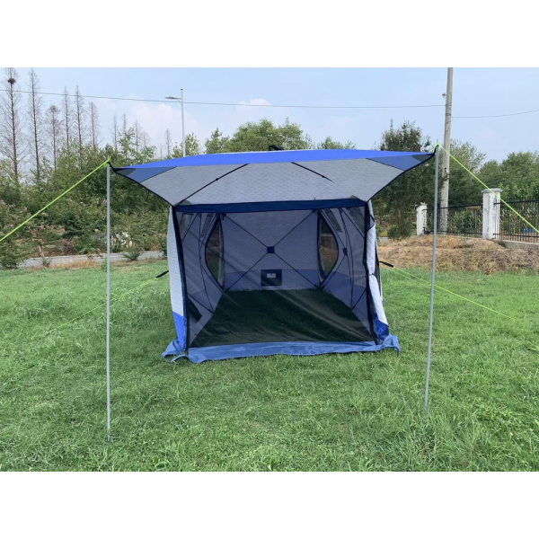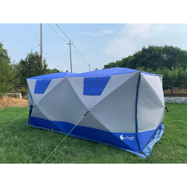 - Ткань палатки - трехслойная (оксфорд+утеплитель термофайбер). Это гарантирует высокую теплоизоляцию и водостойкость. Ткань дышит, не создает парникового эффекта. Усиленные оттяжки на боковых стенках обеспечивают дополнительную стабилизацию палатки при сильном ветре или снеге.